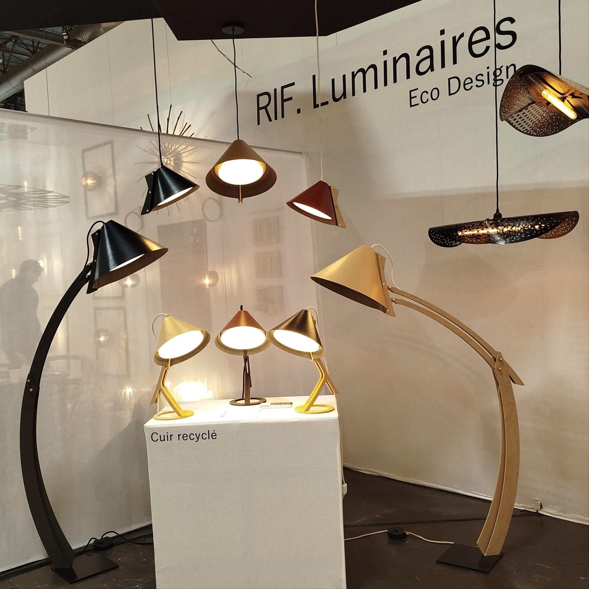 -la gamme SILENCE en cuir recyclé composé de lampes à poser, suspensions et lampadaire réglable.